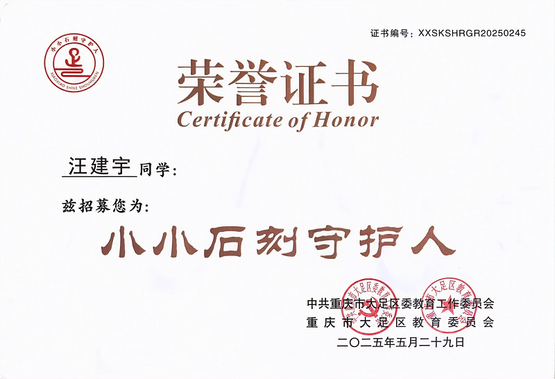 近日,由重庆市大足区教育委员会主办的“选树2025年‘小小石刻守护人’”活动传来捷报:汪建宇(个人)、许婉婷(个人)、团委实践服务分队(团体)被授予“小小石刻守护人”称号。这一佳绩充分彰显了jdb电子围绕立德树人根本任务,将大足石刻文化蕴含的中华优秀传统文化全方位融入日常教育教学管理中,在学生心灵播撒具有中国底色与大足印记的种子;也充分展示了jdb电子青少年践行社会主义核心价值观的精神风貌,主动汲取大足石刻文化精髓,自觉接受优秀传统文化的熏陶,厚植家国情怀。